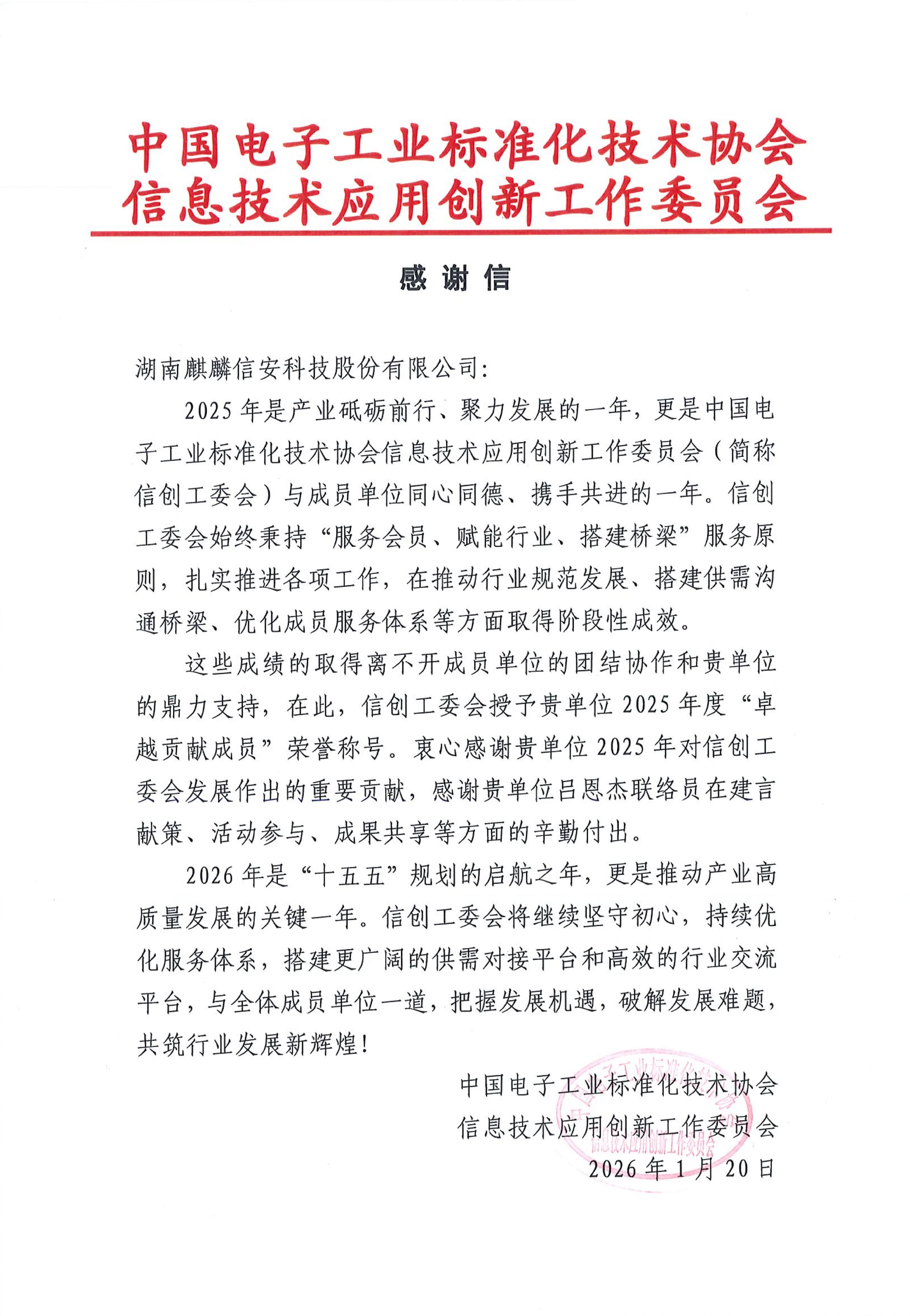 与此同时,麒麟信安还收到了来自信创工委会的感谢信。信中对公司2025年度的工作给予了高度评价,充分肯定麒麟信安在贯彻工委会“服务会员、赋能行业、搭建桥梁”宗旨中所给予的鼎力支持,为信创行业高质量发展作出了积极贡献。近日,中国电子工业标准化技术协会信息技术应用创新工作委员会(简称:信创工委会)向麒麟信安授予年度“卓越贡献成员单位”荣誉称号,并对公司在信创生态建设中做出的重要贡献表示衷心感谢。这是麒麟信安连续第三年获此殊荣。