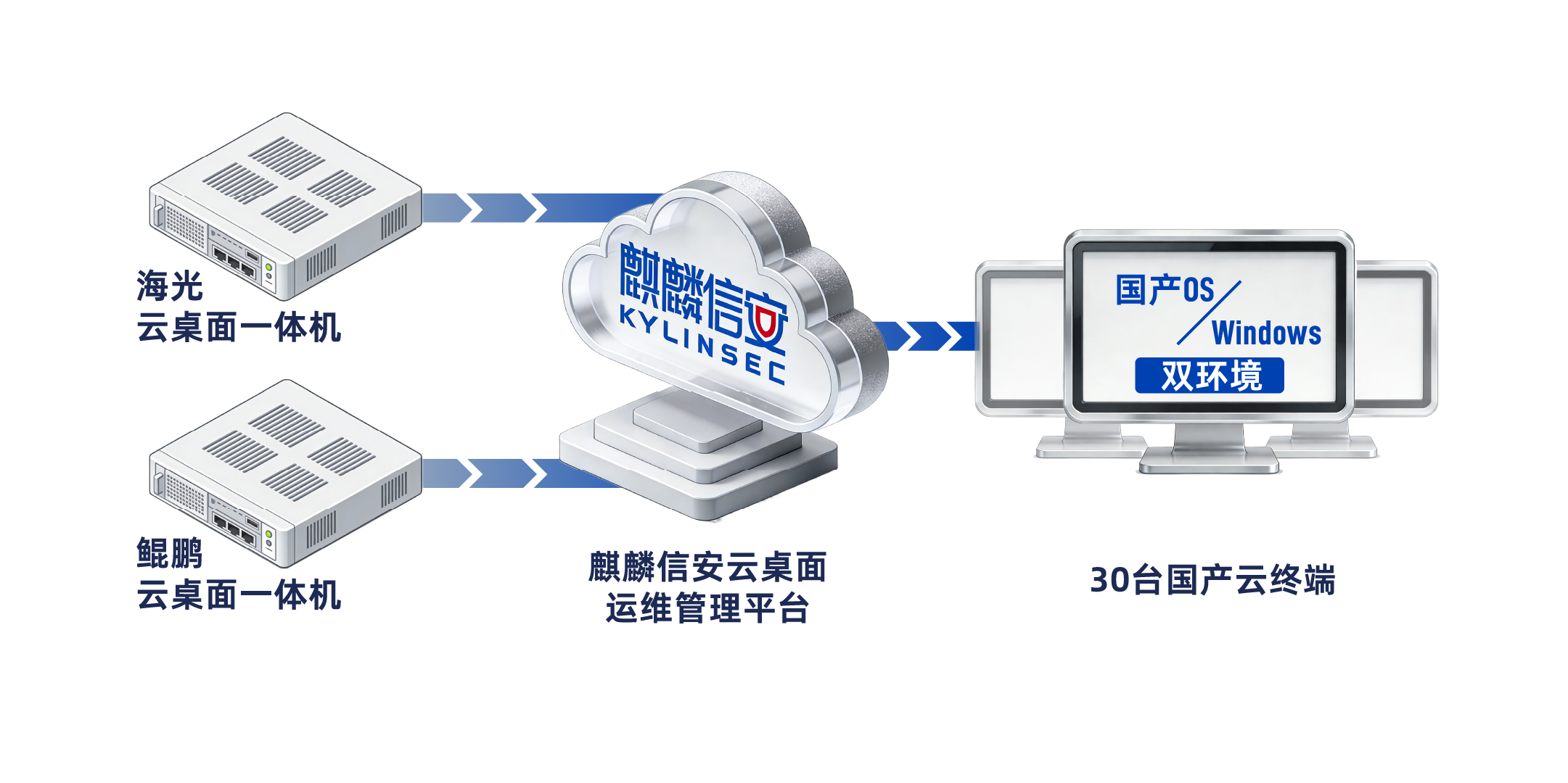 针对这一需求,麒麟信安为交警总队数据中心部署双芯异构国产化云桌面运维平台:采用1台海光 1台鲲鹏云桌面一体机,搭配30台国产云终端,推送国产 Windows双环境,彻底改变了交警总队数据中心第三方运维的形态。