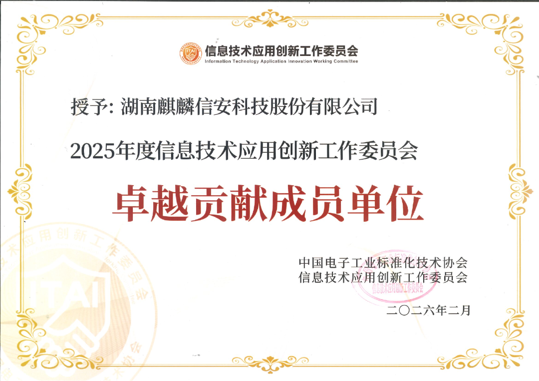 与此同时,麒麟信安还收到了来自信创工委会的感谢信。信中对公司2025年度的工作给予了高度评价,充分肯定麒麟信安在贯彻工委会“服务会员、赋能行业、搭建桥梁”宗旨中所给予的鼎力支持,为信创行业高质量发展作出了积极贡献。近日,中国电子工业标准化技术协会信息技术应用创新工作委员会(简称:信创工委会)向麒麟信安授予年度“卓越贡献成员单位”荣誉称号,并对公司在信创生态建设中做出的重要贡献表示衷心感谢。这是麒麟信安连续第三年获此殊荣。